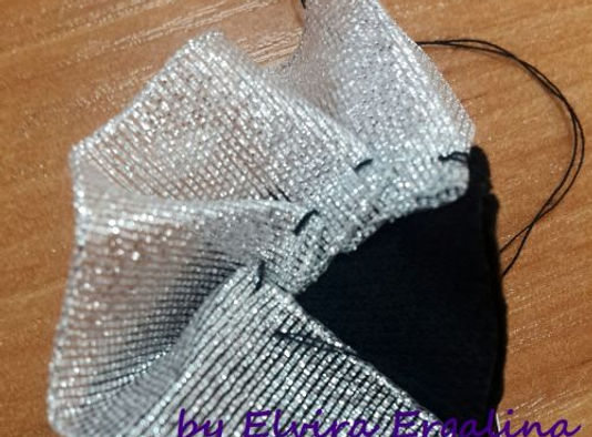 3 бөлік сопақ матаның екеуін аламыз да, ж иегіне лентаны желбезектеп тігеміз. Бір мата қалу керек.